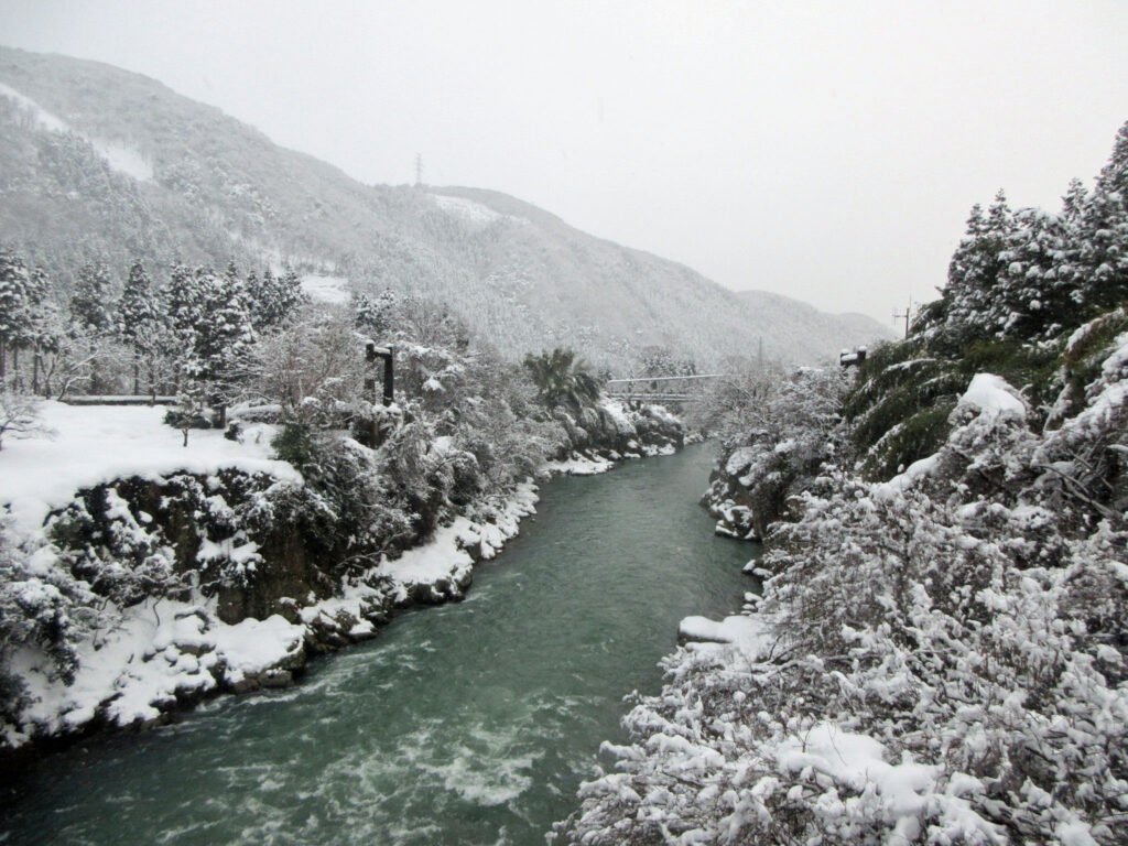 その白山を源流とする手取川は加賀平野を流れ、日本海に注ぎこむ。手取峡谷にある落差32㍍のダイナミックな綿ヶ滝は見る人を圧倒する。先月、雪が舞う白山市を訪れると、峡谷を流れる手取川はまるで山水画のような幻想的な風景を描いていた=写真・下、1月30日午後3時ごろ撮影=。さらに下ると、手取川の水は扇状地を流れ、加賀平野へと広がる。こうして、白山と手取川を眺めると、まさに「大地の公園」だ。