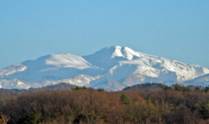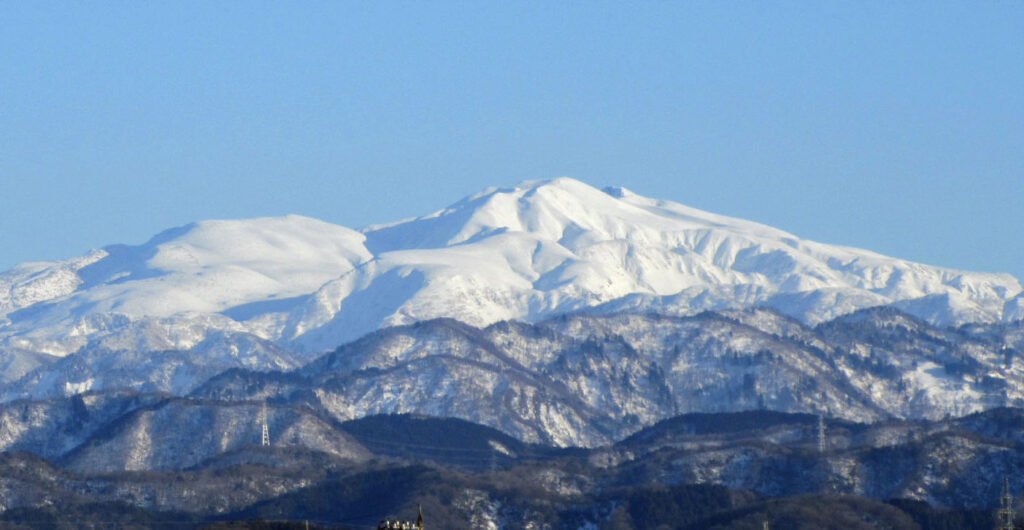 冬場のひと時の青空に映える白山の眺望を楽しんだ。先日(今月19日)石川県小松市で所用があり、その帰りの午後4時半ごろの光景だ。日本海側から光りに照らされ、大汝峰が白く輝き、その右側に最高峰の御前峰がくっきりと見えた=写真・上、小松市から撮影=。白山は北陸3県ほか岐阜県にまたがる標高2702㍍の活火山であり、富士山、立山と並んで「日本三名山」あるいは「三霊山」と古(いにしえ)より称される。奈良時代には禅定道(ぜんじょうどう)と呼ばれた登山ルートが開拓され、山岳信仰のメッカでもあった。