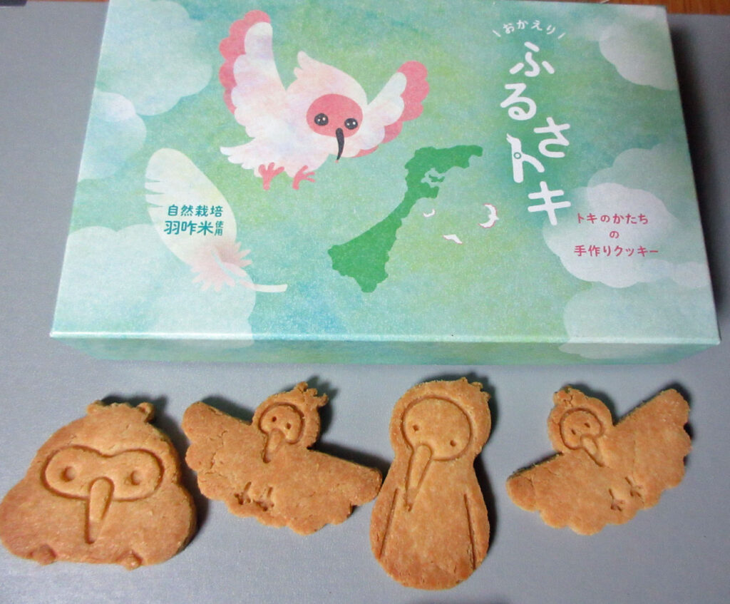 トキの姿をかたどったクッキーを、羽咋市にある県立羽松(うしょう)高校の教員の方からいただいた。同校は邑知潟南側の近場にある。この位置からすれば、校舎の窓からトキが飛ぶ姿を見ることができるだろう。羽松高の生徒たちが金沢市でクッキー教室を開いている講師の女性と協力してクッキーセットをつくった。クッキーは、羽ばたくトキなど4種類あり、そのデザインの一部を生徒たちが考案した。なるほどと思ったのはその商品名で、『おかえり ふるさトキ』=写真・下=。上述した眉丈山はかつてのトキの棲息地であり、そのふもとにある邑知潟や田んぼは餌場でもあった。トキがいよいよ古里に帰って来る、そんな熱い想いを盛り込んだ商品名ではないだろうか。