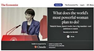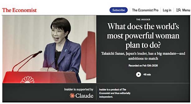 先日、このブログで「世界の投資家は高市内閣が3分の2の議席を獲得したことに驚きと同時に今後の可能性に興味を持って、『高市買い』をしているのではないだろうか。『鉄の女』と称されたイギリスのサッチャー首相をイメージしているのかもしれない」(2月11日付)と述べた。その後、世界の論評を見つけた。イギリスの経済誌「The Economist」公式サイト(現地時間13日付)は大勝に導いた高市総理について、「What does the world’s most powerful woman plan to do?(世界で最も力を持つ女性)」と題して特集記事を掲載した=写真=。