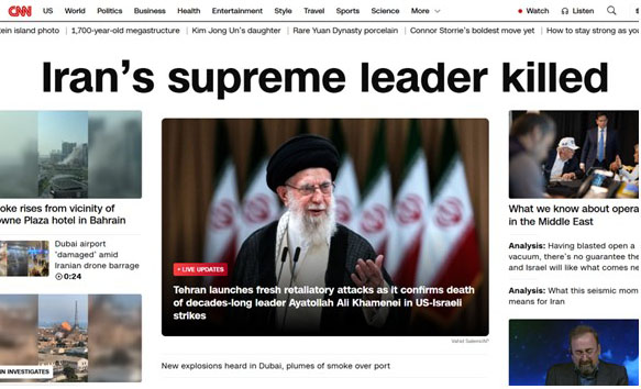 世界ではビッグニュースが流れている。「Iran’s supreme leader killed」。アメリカのCNNがニュースサイトのトップで、イランの最高指導者ハメネイ師がイスラエルとアメリカによる攻撃で殺害されたと報じている=写真・下=。さらに、CNNは、アメリカのトランプ大統領のSNS「トゥルース・ソーシャル」への投稿を引用して以下のように報道している。トランプ氏はSNS投稿で、ハメネイ師の殺害を称賛。ハメネイ師については「歴史上最も邪悪な人物のひとり」と呼んだ。さらに、トランプ氏は「これ(ハメネイ師の死亡)はイラン国民だけでなく、すべての偉大なアメリカ国民、そして世界中の多くの国々でハメネイ師と彼の血に飢えた凶悪な一味によって殺害されたり傷つけられたりした人々に対する正義だ」と投稿した。