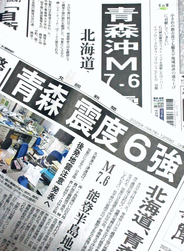 夜中に目が覚め、スマホをチェックして驚いた。青森県の三陸沖を震源とするマグニチュード(M)7.6の地震があったと速報が流れていた。M7.6は能登半島地震と同じなので、地震の大きさは想像がついた。以下、メディア各社の報道による。8日午後11時15分ごろ、青森県八戸市で震度6強を観測する地震があった。気象庁は青森県太平洋沿岸、岩手県、北海道太平洋沿岸中部に一時、津波警報を発令した。9日午前1時10分までに、岩手県の久慈港で70㌢の津波が観測された。