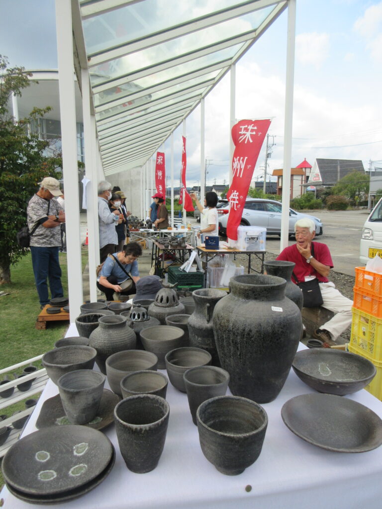 会場となった珠洲市多目的ホール「ラポルトすず」前の広場では、17人の作家が手がけた数々の器や花入れなどが並んでいた=写真・中=。珠洲焼は黒に近い灰色が特徴の焼き物で、平安時代から室町時代に生産された後に途絶えたが、1976年に復活したことで知られる。今回も珠洲焼の復活祭と言える。会場は珠洲焼を求める人々でにぎわっていた。