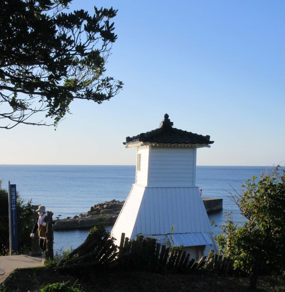 松山さんは地域の歴史や文化、伝統工芸などの魅力を、この地を訪れる人々に伝える「いしかわ文化観光スペシャルガイド」でもある。先に述べた金比羅神社脇の細い坂道を登っていくと、木造の白い建物が見えてくる。日本最古の西洋式灯台、旧・福浦灯台=写真・下=。現在の灯台は1876年に明治政府によって建てられたが、起源は1608年にさかのぼる。北前船の歴史が金比羅神社とつながる、分かりやす説明だった。
