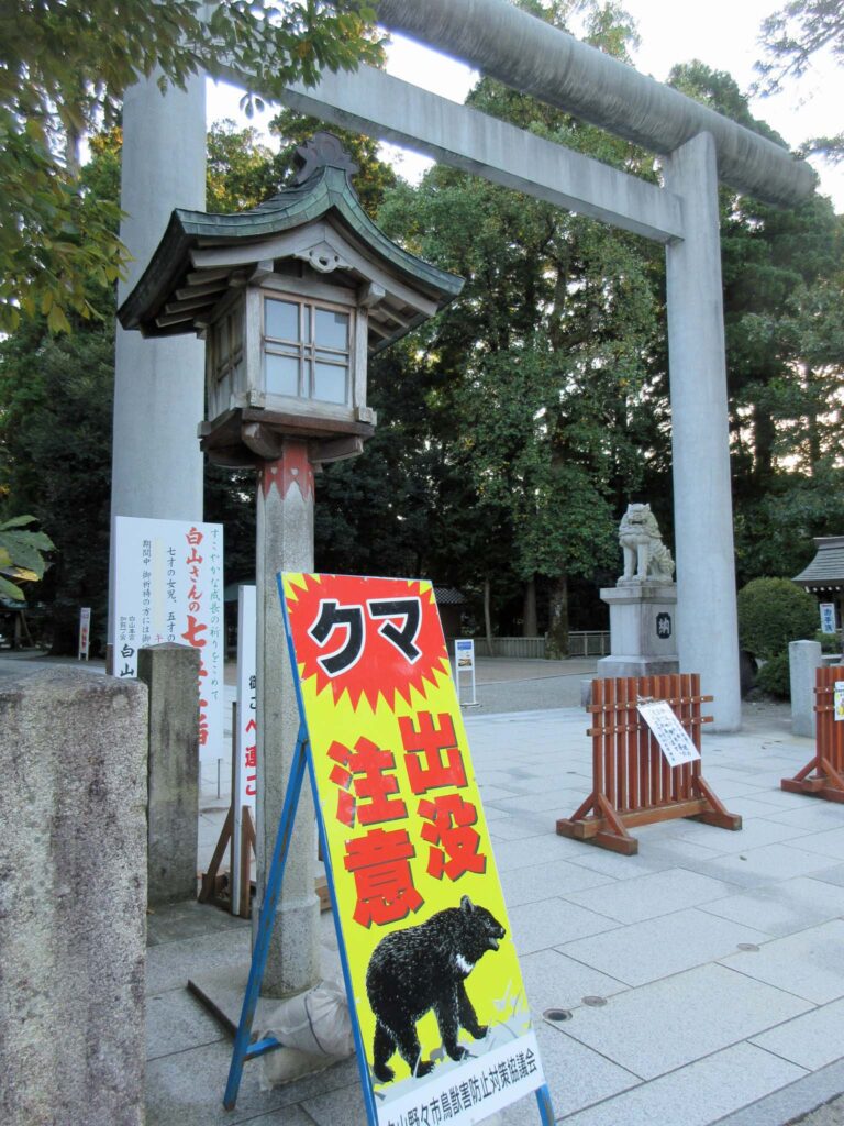 話は変わる。このところ、クマの出没が連日のように全国ニュースとなっている。きのう(22日)金沢市と隣接する白山市にある白山比咩神社の参道でクマが目撃された。きょう神社を訪れると、パトカーが待機するなど重々しい雰囲気だった。今の時節は「七五三詣」のころでもあり、神社の鳥居の下には「クマ出没注意」の看板が立てられていた=写真・下=。