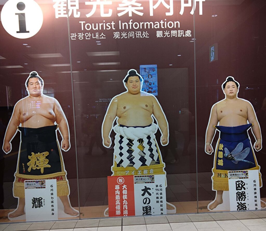 JR金沢駅の入り口の観光案内所では、石川県の郷土力士の等身大パネルが設置されている。きのう駅に行くと、パネルが入れ替わっていた。横綱の大の里と十両の輝はそのままだが、元小結の遠藤が引退したため外れ、新入幕で前頭の欧勝海が加わった=写真・上=。パネルを眺めていると、やはり大の里には貫禄がある。その大の里はきのう「4日目の鬼門」を振り払って、九州場所を4連勝とした。前回の秋場所の4日目で平幕の伯桜鵬に土俵際で突き落とされ、初黒星を喫していた。大関に昇進した昨年の九州場所以降の6場所で4日目は1勝5敗だったので、鬼門は今回で2勝5敗となった。