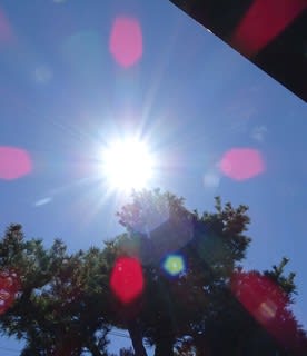 写真はきょう午前10時30分ごろの太陽。樹木の上から激しい日差しが照りつける。周囲の赤い光玉は、強い光源が画面内に入り込むと、カメラのマイクロレンズに反射した光がカバーガラスに二次反射して格子状や赤玉のゴーストが写り込む。ネットで検索すると、このゴースト現象は「サッポロポテト現象」と呼ばれている。カルビーの商品「サッポロポテト」のポテトチップスと形状がよく似ていることからカメラマンの間ではそう呼ばれているようだ。きょうも金沢は37度を超えそうだ。