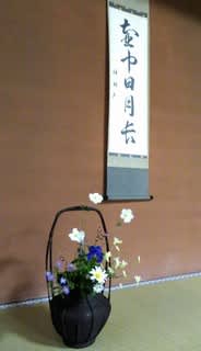 庭園の清掃ボランティアと茶の湯という小さな空間だが、それはそれで歴史的な背景もあり、人の作法や人生観、人と自然のかかわりが時空として深く広がる。掛け軸の壺中日月長(こちゅうじつげつながし)という禅語はこの一日のことを筆一行に凝縮しているように思えた。