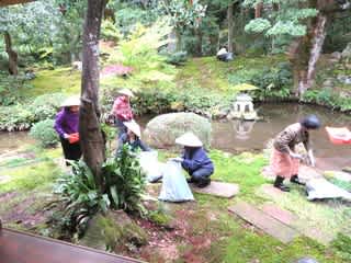 同社の庭園は「築山池泉式」と呼ばれる江戸時代に造られた書院庭園。湧水の池は「心」をかたどり、池のきわにはタブの巨木がそびえる。市指定名勝でもある。今回午前と午後に分けて30人余りのボランティアが参加。サンショウウオが住む池の周囲で落ち葉を拾い集めたり、草刈りなどを行った。参加したボランティアのほどんどが女性。東京や大阪などから観光で訪れ偶然イベントを知って参加した人たちや、フアン氏の活動を支援する外国人も。また、趣味で寺巡りをしている女性、テラジョ(寺女)と呼ばれる人たちもいてなかなかにぎやか。2時間ほどの作業で、庭園が清められた=写真・上=。