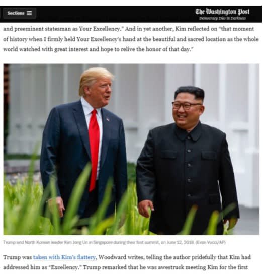 ウッドワード氏の古巣でもあるワシントン・ポスト紙は、トランプ氏がウッドワード氏に語った北朝鮮の金正恩党委員長についての人物評を紹介している=写真=。その中で面白い下りがある。「Trump told Woodward that he evaluates Kim and his nuclear arsenal like a real estate target: “It’s really like, you know, somebody that’s in love with a house and they just can’t sell it.”」(9月9日付・ワシントン・ポストWeb版)。意訳すると、金氏と核兵器の関係は家主と不動産の関係と似ていると評した。それは、家主が自分の家を気に入っていると売却したくてもできないのと同じだ、と説明した。