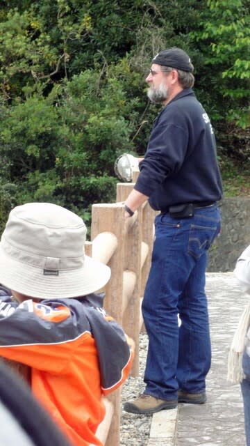 訪れたのは5月5日午前10時ごろ。追い込み漁が行われている小さな入り江へ行く=写真・上=。イルカが網にかかっており、翌日市場が再開するので漁業関係者が網からイルカを外して解体処理場に運んでいた。その様子を橋の上からオバリー氏が見ていた=写真・下=。もう一人の外国人が沿岸で漁の様子をカメラ撮影していた。和歌山県警の警官も数人いて、周囲にはちょっとした緊張感があった。