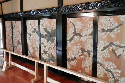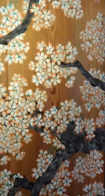 堂々とした建物の外観もさることながら、内部には深氷氏が遺した芸術作品がある。正面玄関から入ると、左手に杉の板戸6枚に描かれた見事な桜が出迎えてくれる。 作品名は「桜心(おうしん)」=写真・中=。この絵を眺めていると、現代画壇という感じではなく、まさに江戸時代の絵師の筆の勢いというものが伝わってくる=写真・下=。この絵を鑑賞していると新たなアイデア創出や思考力といった感性が高まるような気がする。板戸だけではない。芸術的な工夫が凝らされた玄関やトイレ、客間なども感慨深い。