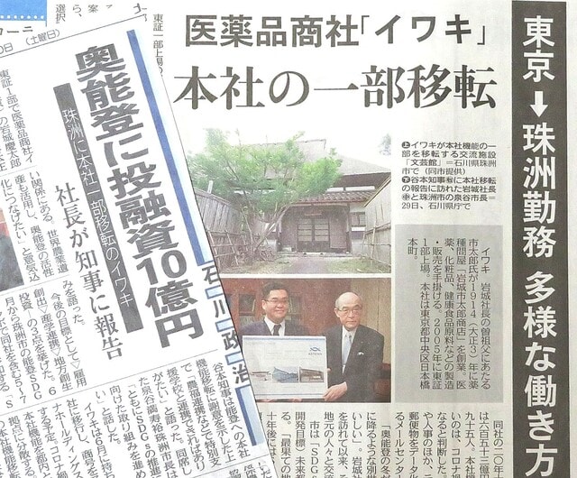 日経新聞北陸版(1月23日付)で、東証一部の医薬品商社「イワキ」が東京都中央区にある本社機能をことし6月から石川県珠洲市に段階的に移転するというニュースが掲載されていた。記事によると、本社機能は経営企画、人事、経理、情報システムなどの部門が含まれ、約110人を予定し、東京と石川で居住地や就労地を選べるようにする。新型コロナウイルスの感染拡大が続く中、本社機能の一部を珠洲市に分散し経営上のリスクを減らす。珠洲の原材料を使用した商品を開発するなど地方創生に関わる事業の創出にもつなげる。