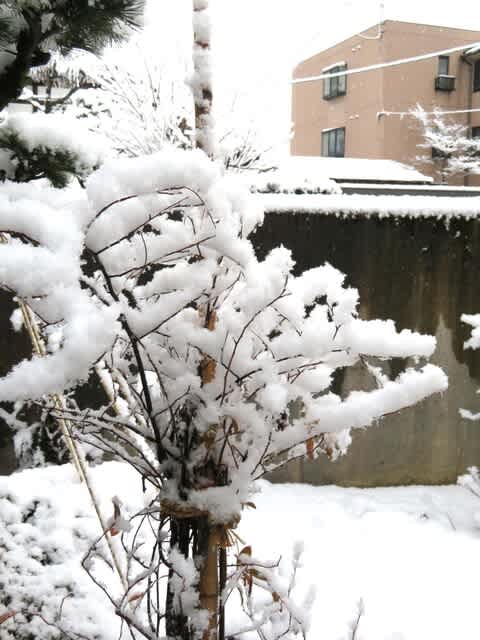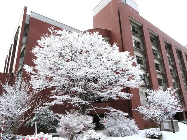 綿雪は雪の結晶がくっつき合っている。なので、樹木の枝などに降りかかると、まるで花のように見える。大学の校舎をバックした樹木はまるで、満開のソメイヨシノのようにも見えて壮観だ=写真・下=。ただ、気温が少し上がり、午前中には溶けてしまった。数時間だったが、冬の華を楽しませてもらった。