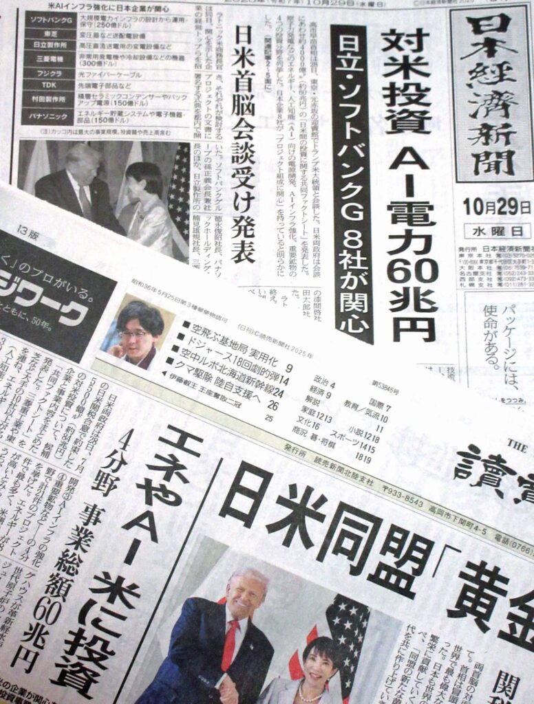 それにしても総理就任から1週間で日本にとって最も重要な日米外交を高市総理はこなし切ったイメージだ。会談に関する共同文書は作成しなかったが、ことし7月の日米関税合意で約束した巨額投資の履行と、レアアースなど重要鉱物の供給と確保に向けた協力の2つの文書に署名した。署名は実行を約束したことになる。中でも気になるのが、5500億㌦(約84兆円)とされる巨額な対米投資の内容だ。メディア各社の報道(29日付)によると、すでに国内の21社が名乗りを上げているようだ。