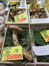 金沢の近江町市場は季節の食材がずらりと並んでいる。少々驚いたのが能登産マツタケの価格。1本150㌘の大きさのものが3万8000円、小さいもの9本300㌘で4万8000円の値札がついていた=写真・上=。店の人に「いつもの年より(値段が)高いね」と声かけすると、「ことしは不作なんですよ。残暑が長く続いて、大雨もあったせいですかね」との返答だった。確かに、店頭には能登のほか国産のマツタケそものが少ない。店の人によると、例年より4割から5割ほど高値だという。むしろ、カナダ産や中国産、ヒマラヤ山脈産などが多く並んでいて安い。