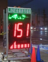 近所のガソリンスタンドの前を通ると、「会員価格151円」の表示が出ていた=写真・上=。会員ではないが、安くなっているので給油した。非会員の単価は1㍑156円だ。同じスタンドで11月27日に給油したときは161円、10月24日は173円だったので、この数ヵ月で随分と価格が下がった。金沢市内でガソリンの小売価格が150円だったのは2021年と記憶しているので、4年ぶりではないだろうか。