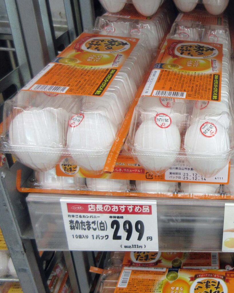 一方、鶏卵は高値止まりが続いている。「物価の優等生」と称され、長らく価格が安定していた。スーパーでは10個入りパックが200円前後で売られていて、特売日では160円だった。それが、2022年12月ごろから1パック「269円」、今では「店長おすすめ品」ではあるものの、1パック299円(税込み323円)だ=写真・下=。