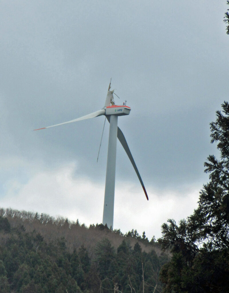 風力発電は再生可能エネルギーのシンボルでもある。風速3㍍でブレイドが回りはじめ、風速13㍍/秒で最高出力1500KWが出るとされる。能登半島の沿岸部、特に北側と西側は年間の平均風速が6㍍/秒を超え、風力発電には最適の立地条件のようだ。壊れた風車は山の頂の部分に設置されていて、アクセスが難しく、修復に時間がかかっているのだろうか。とりとめなくブログを綴った。