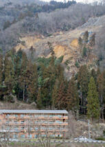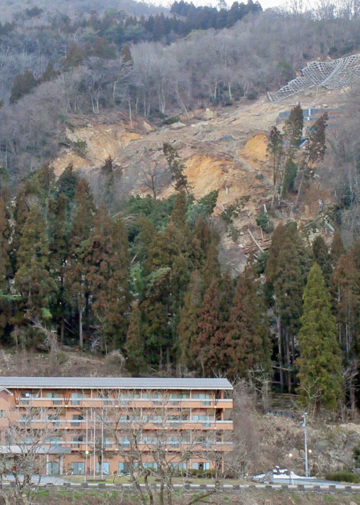 「崩れ」と言えば、石川県白山市の高齢者が入るケアハウス(4階建て)の裏山で地滑りが発生し大変なことなっている。地元メディア各社の報道によると、おととい(10日)朝にメキメキと木が倒れる音がして、施設の入居者48人や職員、近所の住人ら77人が近くの小学校やコミュニティセンターなどへ避難した。きのう午後、現場に行ってみると、施設の真上に当たる山の斜面地で幅100㍍、200㍍ほど崩れていた=写真・中=。発生現場は地滑り防止区域になっていて、近くでは2022年8月に大雨で斜面が崩れたため、対策工事が施されていた。
