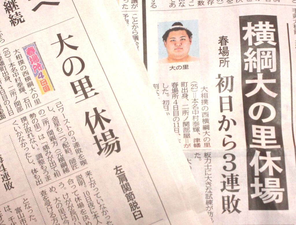 まさに荒れる春場所だ。石川県の郷土力士、横綱の大の里は3連敗できのう休場した=写真・上=。日本相撲協会に「左肩関節脱臼で3週間の安静加療」の診断書を提出したようだ。大の里の休場は千秋楽を休んだ去年の九州場所以来で2度目となる。同じく横綱の豊昇龍は初黒星を喫した。綱取りを目指す大関の安青錦は2敗に後退。同じく大関の琴桜も初黒星。横綱、大関が総崩れの状態。