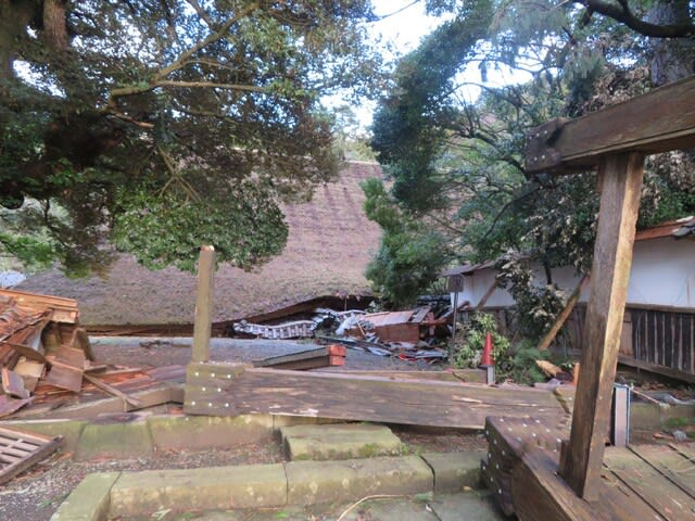 厚さ1㍍にもおよぶ茅葺の屋根が地面に覆いかぶさるように倒壊した。上時国家の古文書8千点余(石川県指定文化財)も主屋と離れを結ぶ廊下に保管されていたが、家屋の下敷きとなった。それを国立文化財機構文化財防災センターのスタッフや石川県教委の職員、大学教授ら20人でレスキュー活動を行い運び出した。