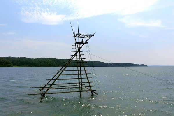 そして、「あれ、櫓(やぐら)に人が」と一瞬思ったのが、七尾市から北上した穴水町の海岸沿いで見た「ボラ待ち櫓(やぐら)」だった=写真・下=。穴水湾では櫓に漁師が上って、ボラなど魚群が湾に入って来るのを見つけて、「ボラが来た」と叫ぶと、周囲の人が集まって海に仕掛けた漁網を引き上げるという漁法があった。現在その漁法はないが、観光施設としてボラ待ち櫓が湾